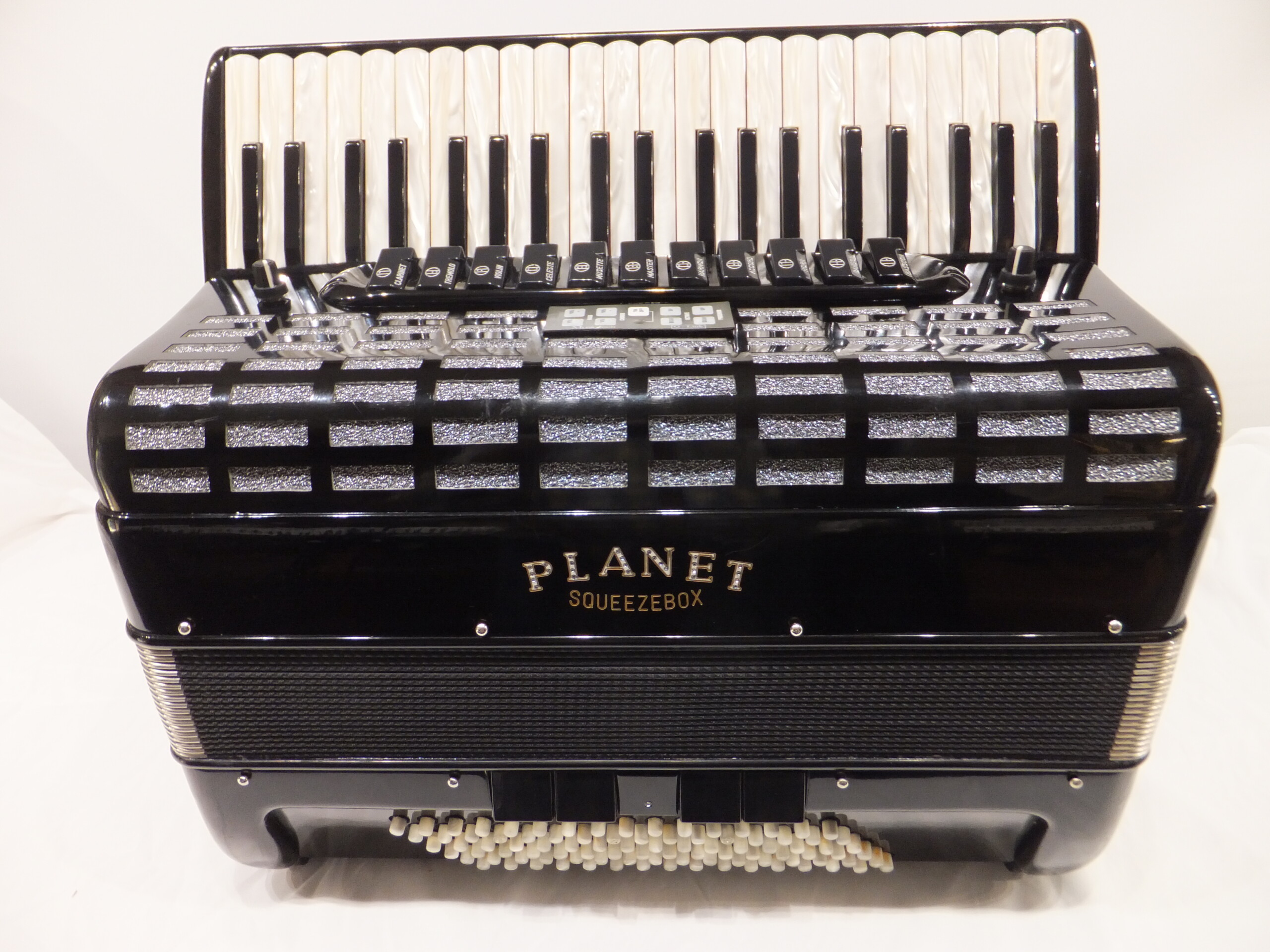 It's nice to find a Planet 96 bass w/midi and pick-ups to make available. All Planets are ordered with handmade reeds among many other specifics, so, you can count on new or used, you're getting some of the best accordions available. This Planet Squeezebox has 4/5 sets of reeds (LMMM) with an 18 5/8-inch keyboard and weighs in at 24 Lbs.. So, with the variety of musettes and the full accordion sound along with the midi and pick-ups, all you'd need is a module and you'll be performing to your hearts content. Includes the power supply and cables. Module and amp not included.
