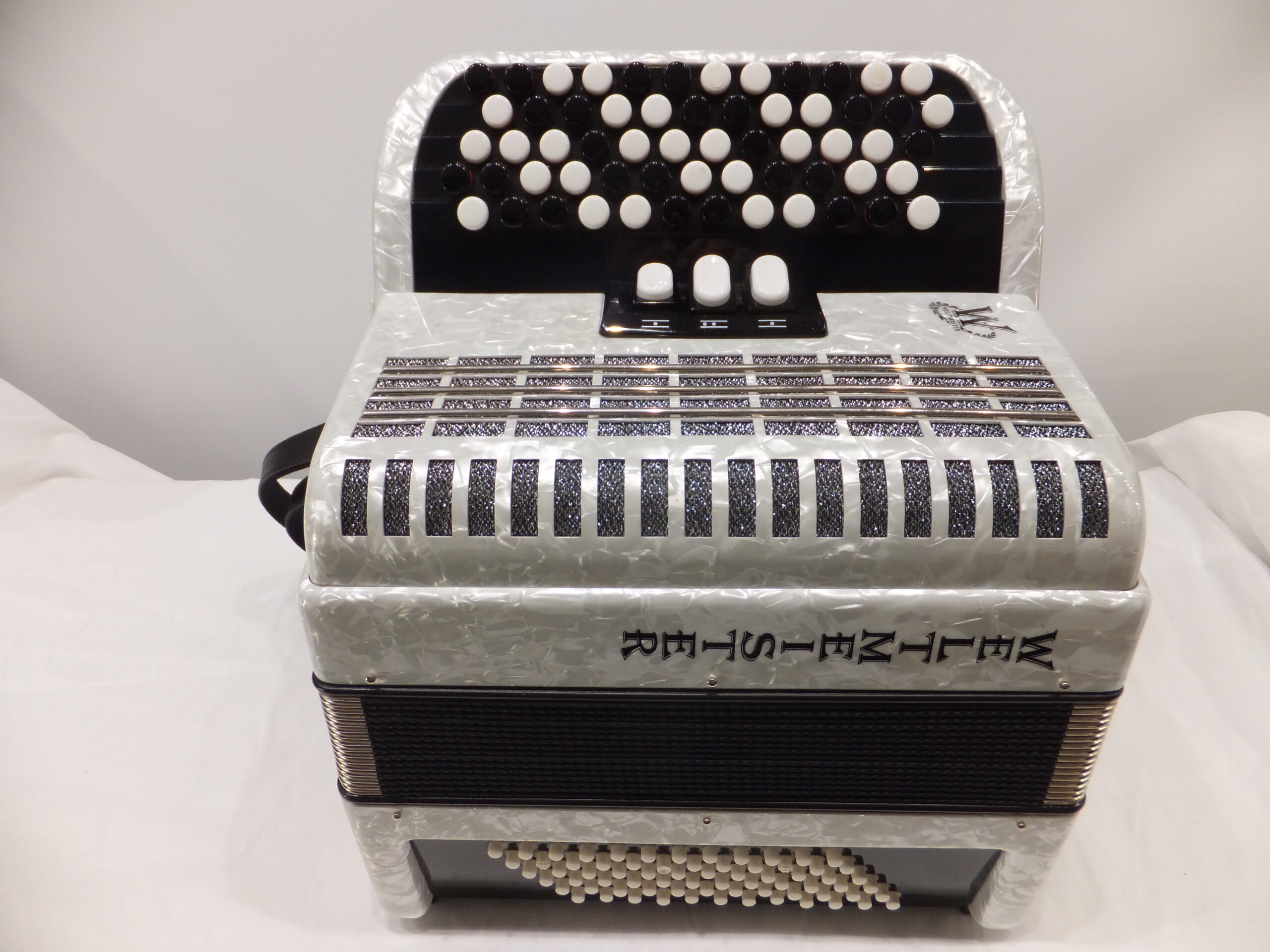 This German made Weltmeister Diatonic button accordion has 3 rows, ADG with 5 switches right hand, 3 sets of reeds LMM with a nice musette and full accordion sound. And being only 12 Lbs, with excellent reed response and key action, you're ready to party hardy.